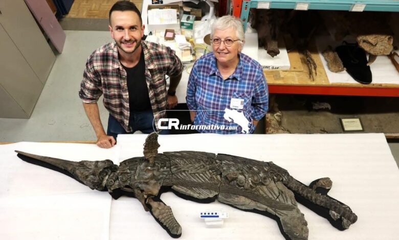 El esqueleto pertenece al Museo Real de Ontario, en Canadá, e incluye un cráneo con una gran órbita ocular y un largo hocico en forma de espada, características que distinguen a esta especie dentro del grupo de los ictiosaurios.